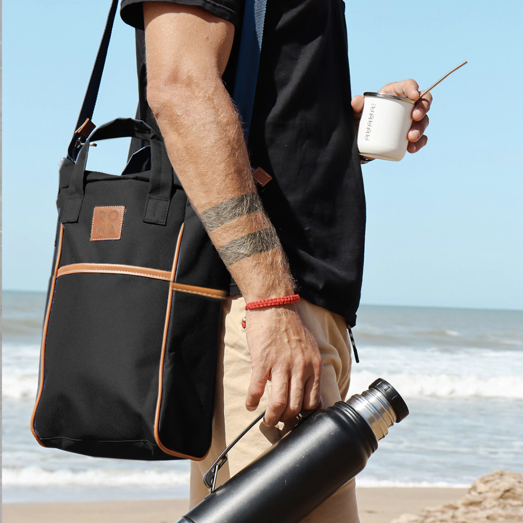 La Matera Centenario es nuestro modelo más tradicional: se lleva al hombro como morral y tiene el tamaño justo para todo tu equipo de mate. Liviana, resistente y con el toque justo para quienes eligen lo auténtico, siempre.